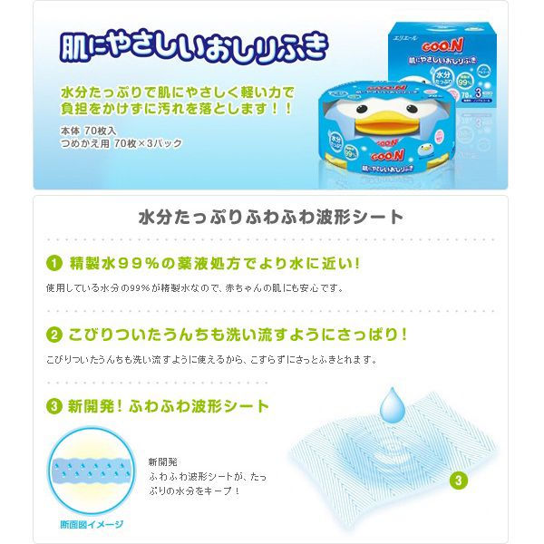 | 製品名 | グーン肌にやさしいおしりふき詰替用70枚×3個パック【ケース販売/12個入】 |