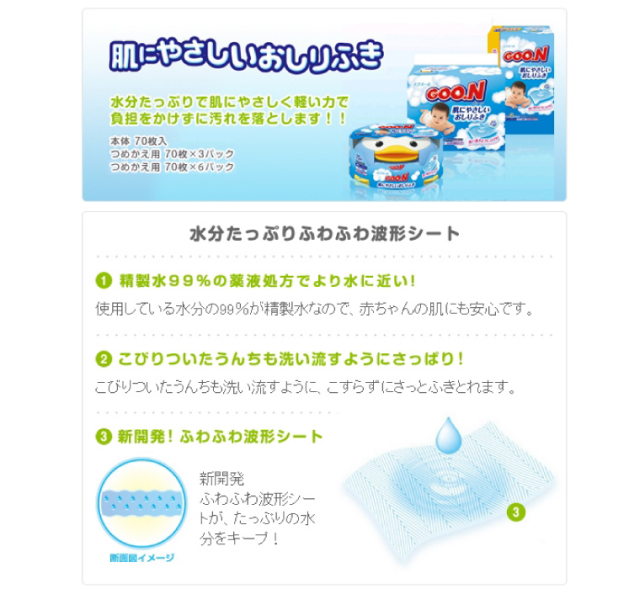| 製品名 | 【おしりふき(ベビー)】グーン肌にやさしいおしりふき詰替用70枚×6個(420枚入)【ケース販売/6個入】 |