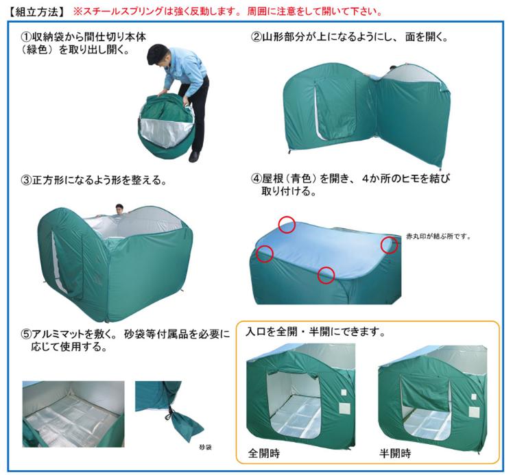 ワンタッチで設営!半面に屋根をつけることにより、災害時のプライバシー確保に!