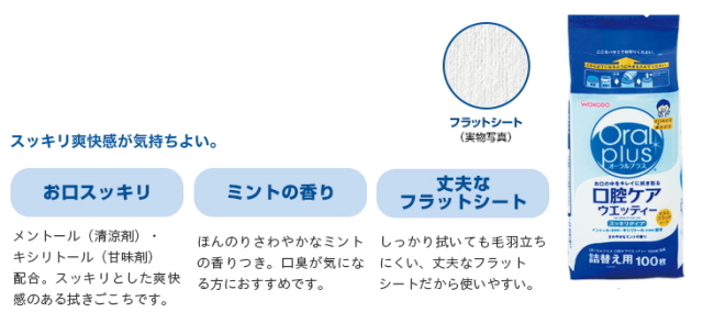 スッキリとした爽快感のある使い心地の拭き取りタイプの口腔ケア用ウエットティッシュです