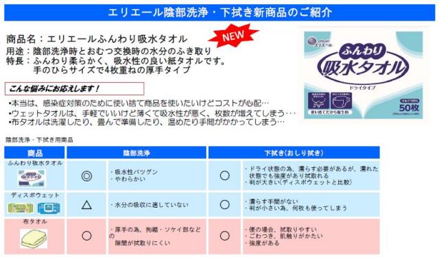 商品説明: ●使い捨てでいつも清潔。 ●陰部洗浄時とおむつ交換時の水分のふき取り。 ●ふんわり柔らかく、吸水性の良い紙タオルです。 ●手のひらサイズで4枚重ねの厚手タイプ。 ●375x280mm ●判が大きい(ディスポウェットと比較)