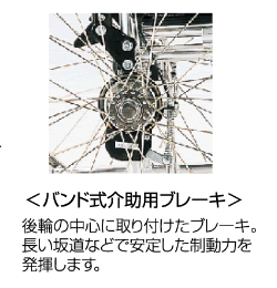 バンド式ブレーキ:後輪の軸に対してロックを掛けるので、ブレーキが前後によく効き安全です。