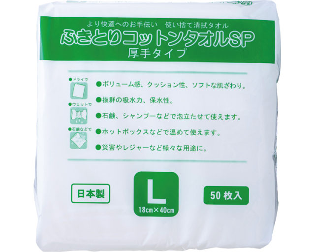 安いっ!!【使い捨て清拭タオル】ふきとりコットンタオルSP L(18×40cm)50枚入 1370円【ケース販売/18袋入】4571134000984