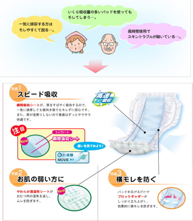 ◆『瞬間吸収シート』で尿をすばやく吸収。一気に排尿しても、横向き寝でもモラさずに安心です。